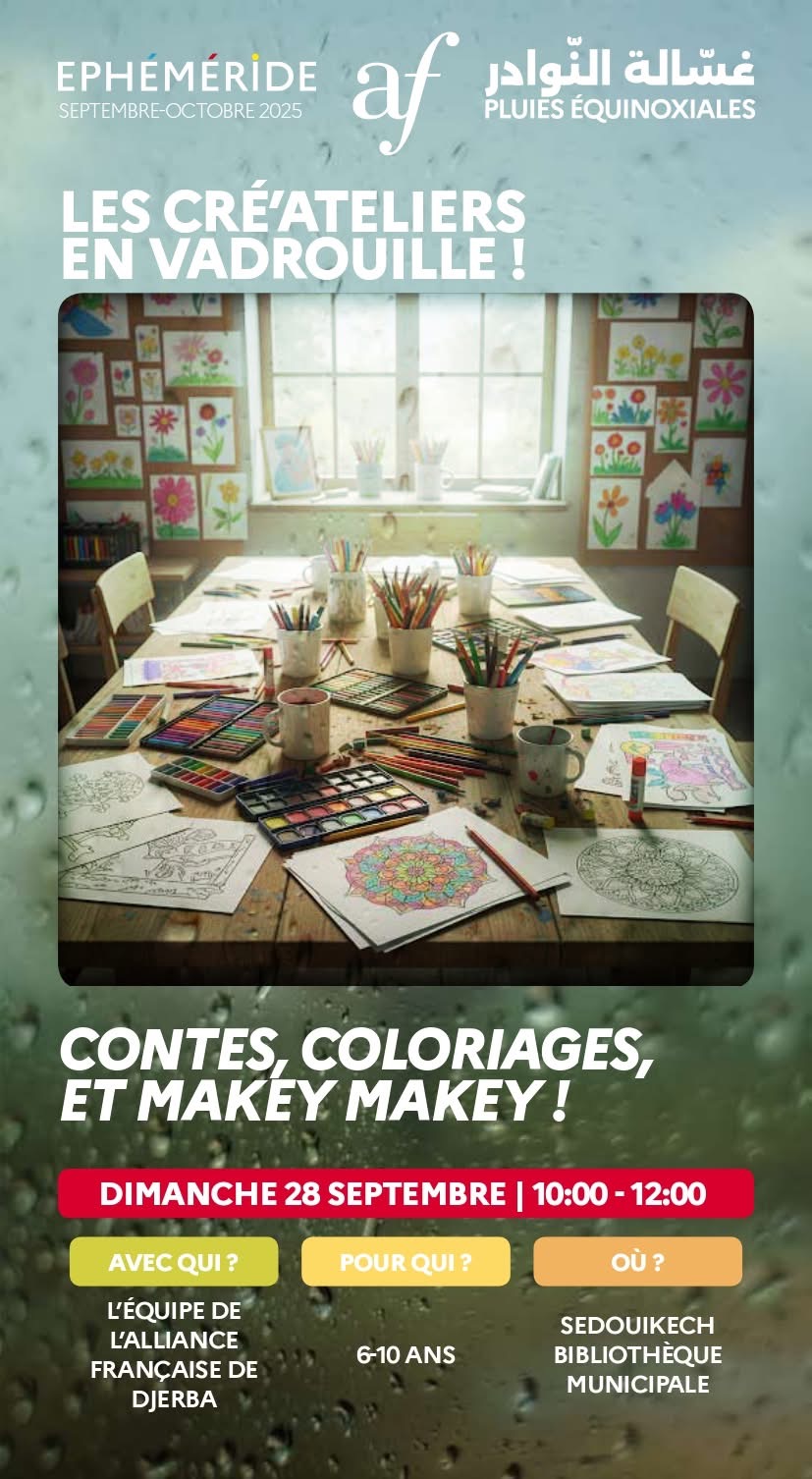 Les Créa’Ateliers en vadrouille reviennent pour une matinée créative et ludique à Djerba ! Le dimanche 28 septembre 2025, de 10h à 12h, l’équipe de l’Alliance Française de Djerba invite les enfants de 6 à 10 ans à explorer leur imagination avec des activités comme Kant Coloriage et MAKEY dans la chaleureuse bibliothèque municipale de Sedgwick.